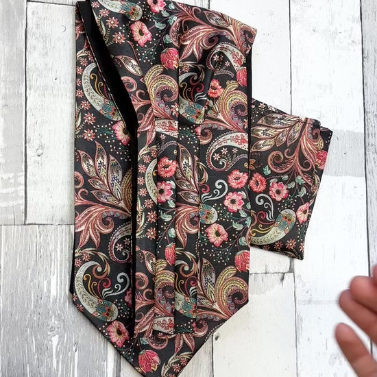 Elevate your style with this Black Floral Paisley Cravat crafted from luxurious vegan silk, offering an ethical alternative without compromising elegance. The cotton backing ensures comfort and structure, making it perfect for all-day wear. A refined accessory for the conscious shopper who values both sophistication and sustainability.