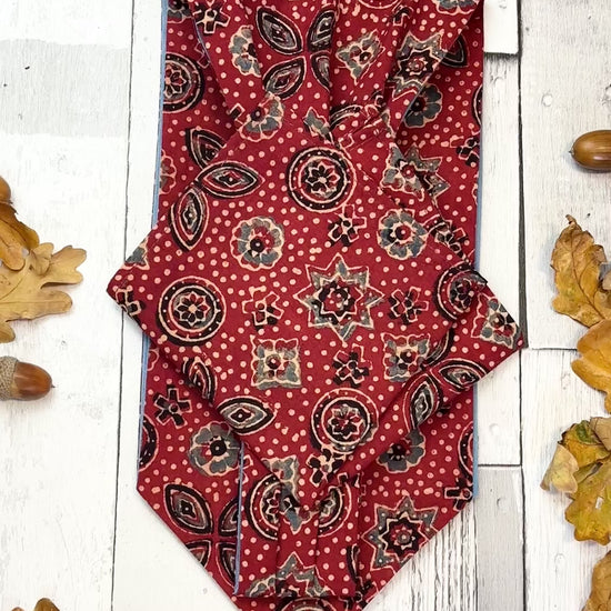 Add a touch of heritage craftsmanship to your outfit with this Kaam Red Ajrakh cotton cravat, hand block printed in Kutch, Gujarat using natural dyes and a centuries-old resist printing technique. Crafted with three intricately carved blocks, this fabric layers detailed motifs over a rich, earthy red palette, creating a cravat that is as striking as it is traditional - and then hand-crafted into a beautiful cravat right here in the UK!
