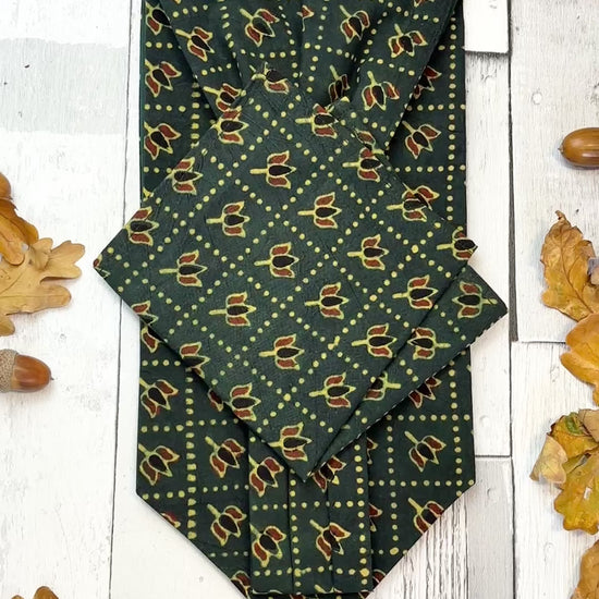 Bring timeless tradition to your wardrobe with this green Ajrakh cotton cravat, hand block printed in Kutch, Gujarat using natural dyes and an ancient resist printing technique, and hand-crafted into a premium men's cravat right here in the UK. Renowned for its earthy tones and intricate patterns, Ajrakh fabric beautifully blends cultural heritage with modern versatility, making this cravat a refined statement piece for any occasion.