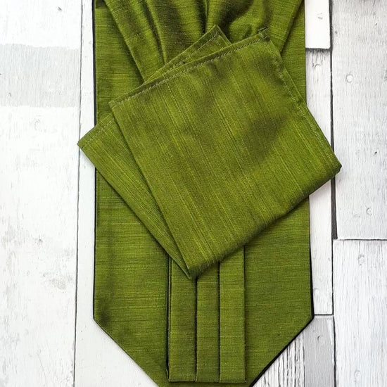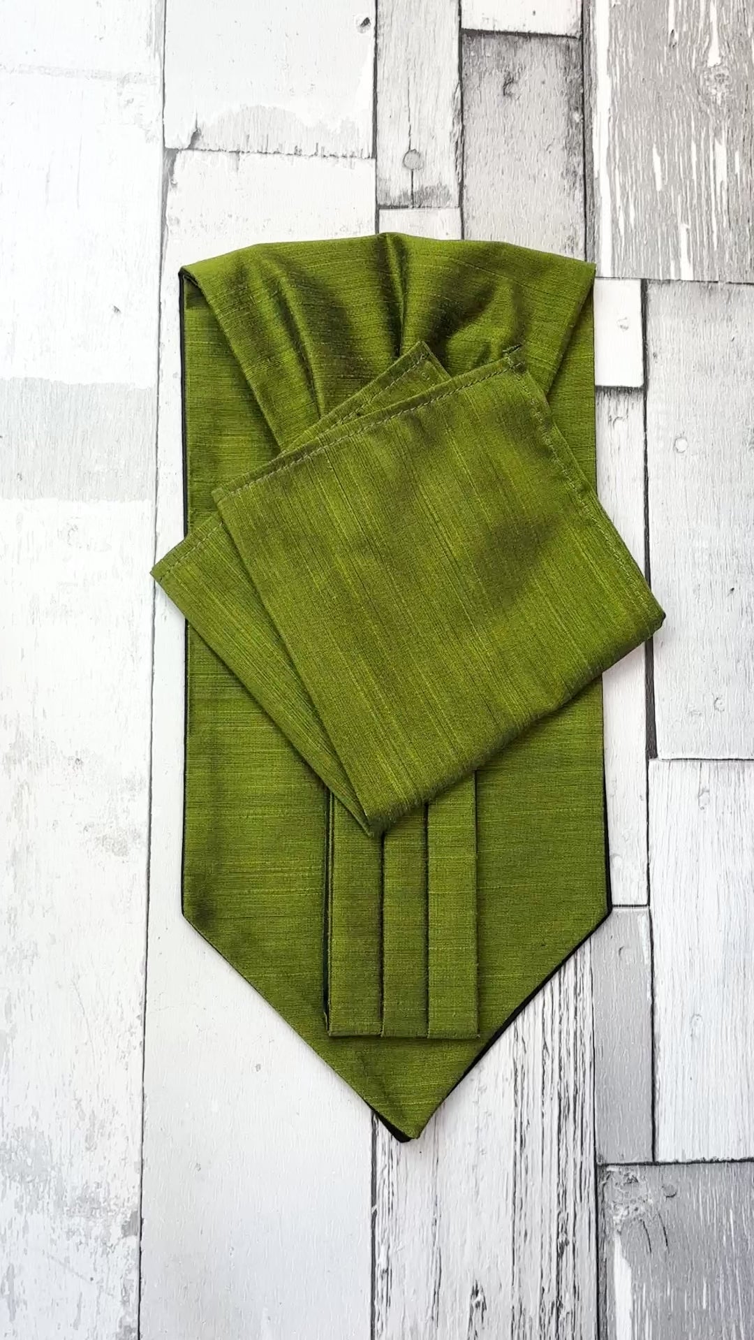 Elevate your ensemble with the Peridot Green Dupion Cravat, expertly crafted from rich jewel-toned doupion fabric. Its cotton backing ensures comfortable wear while providing structure that enhances the vibrant colour. Perfect for adding a refined touch of sophistication to any formal outfit.