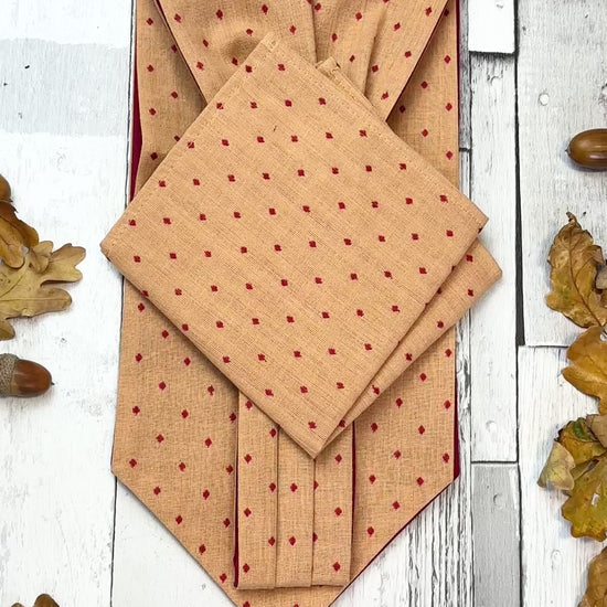 Elevate your wardrobe with this pale orange jacquard cotton cravat, crafted from fine-quality prewashed cotton sourced from Tamil Nadu. Its intricate jacquard weave exudes elegance and sophistication, while the natural fibres provide breathability and all-day comfort - all hand-crafted into our gorgeous men's day cravats right here in the UK!