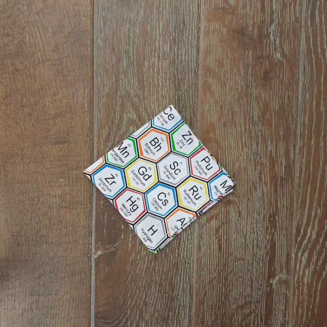 A great gift for a scientist or science teacher, this cotton pocket square has a printed hexagon periodic table design on a white background.