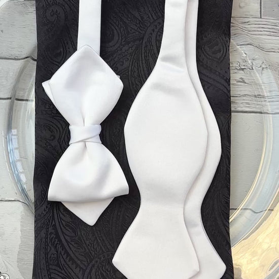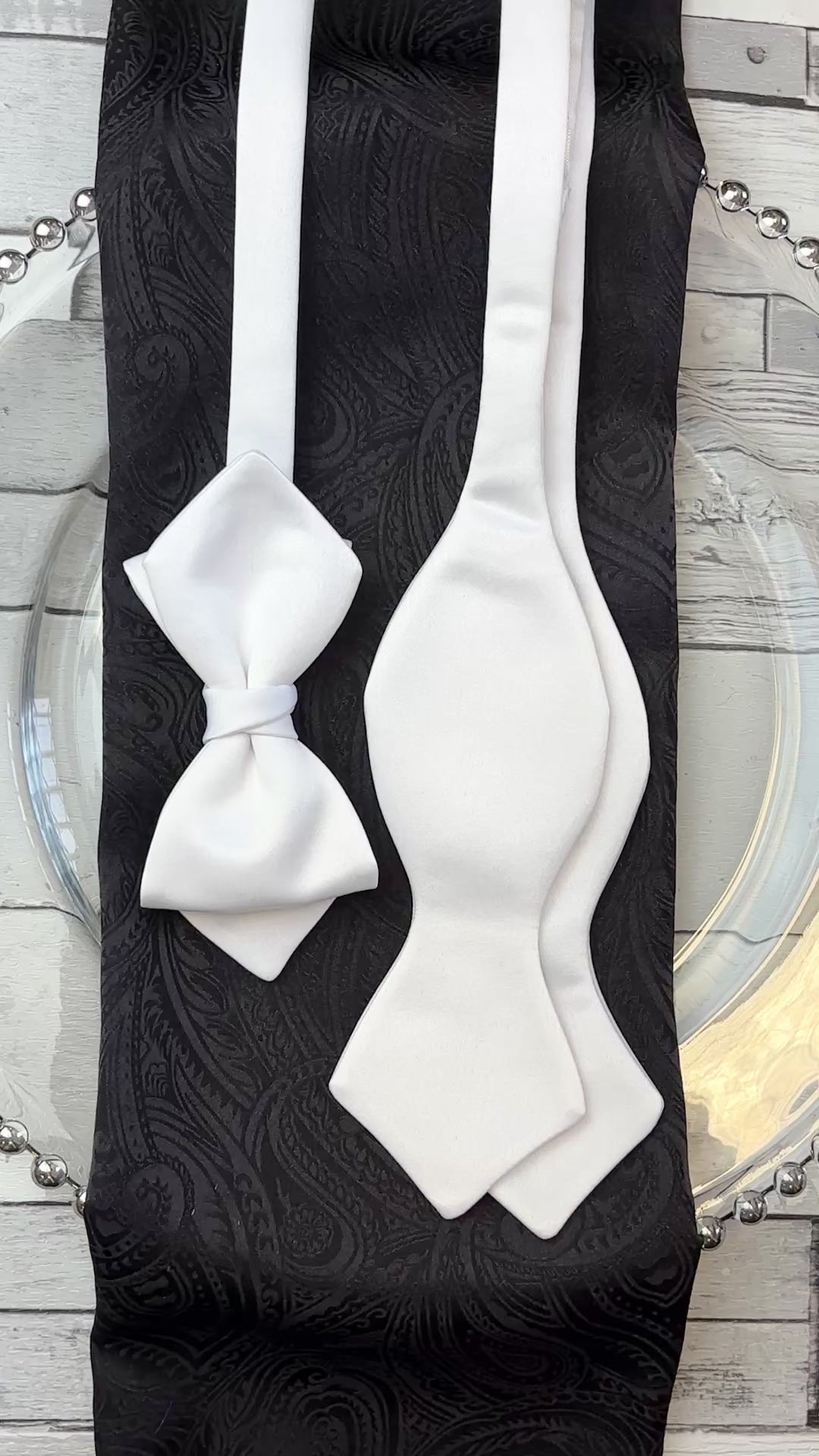 A white satin bow tie, created in the style of a traditional self-tie bow with the classic bow shaping, and faux-twisted knot or as a classic self-tie bow, this bow is perfect for any white tie event! Have all the style without any of the hassle!